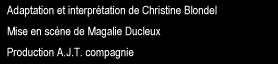 Christine BLONDEL (adaptation et interprétation) Est née à Paris en 1964. Agrégée de Lettres et titulaire d'un D.E.A. d'Arts du Spectacle, elle enseigne au lycée les Lettres et le Théâtre, et anime des ateliers pour amateurs. Sa formation d'actrice lui vient notamment de Claude Giraud et Max Fournel qu'elle a croisé dans les conservatoires parisiens d'art dramatique, et Paul Weaver, au centre Américain. Depuis 1989, elle a monté au sein de sa propre compagnie (A.J.T.) de nombreux spectacles, comme adaptatrice, comédienne et metteur en scène, notamment en 1998-99 : Calamity Jane Lettres à sa fille, où elle interprète Calamity jane. Elle a écrit pour le théâtre : en 1995 William Pig, le cochon qui avait lu Shakespeare (Editions Théâtrales), Ceci est Mon Corps, pièce lauréate de la fondation Beaumarchais (juillet 1999), La vieille Dame et La Mer (l'Ecole des Loisirs), et Nûn le Rire de le Baleine (Edition Lanzmann). |